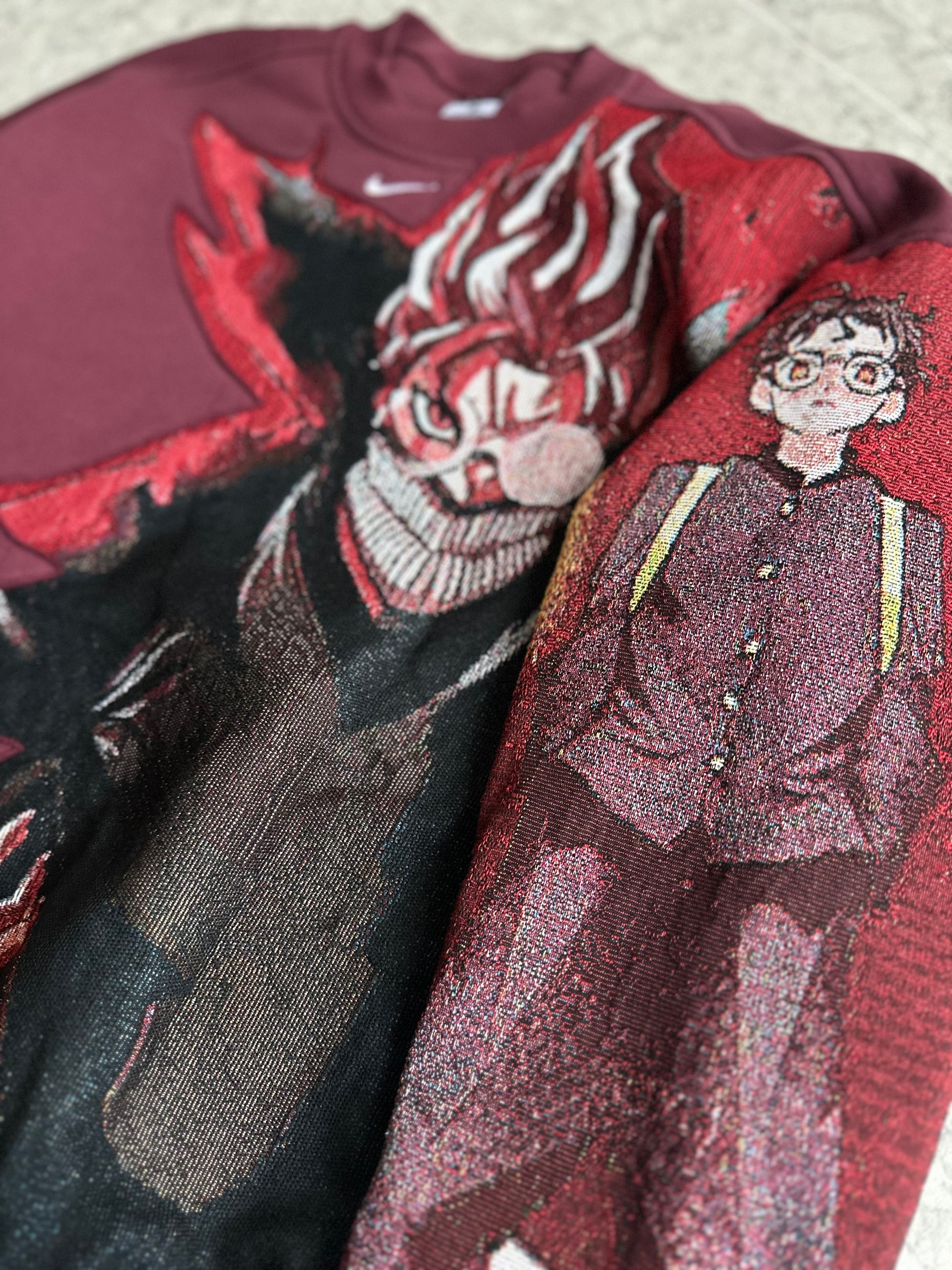 Reworked Nike Center Sweatshirt Maroon with Okarun hair pattern front + Okarun Sleeve